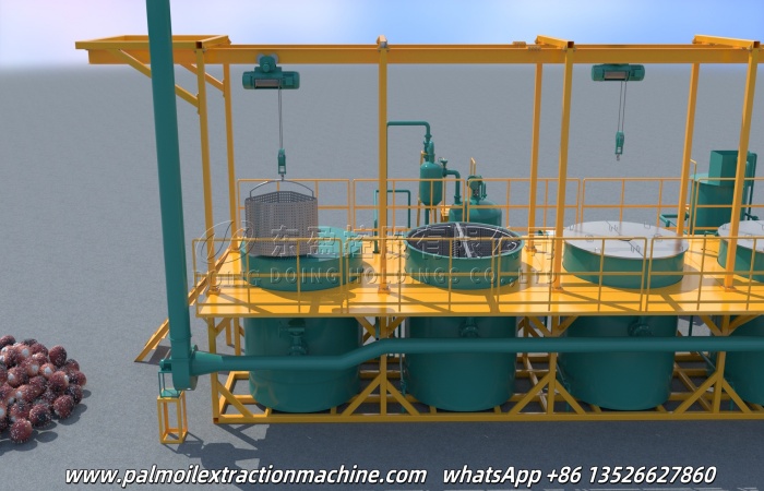 The function of the hot water tank is to provide heat source and hot water for the workshop. For example, hot water is used in the sterilization section and filtration section. There will be a crane above the sterilization tank to transport palm fruit bunches, saving labor costs. The whole sterilization process need two hours, the purpose of which is to soften the fruit, conducive to oil production, while reducing the content of free fatty acids to ensure oil quality.